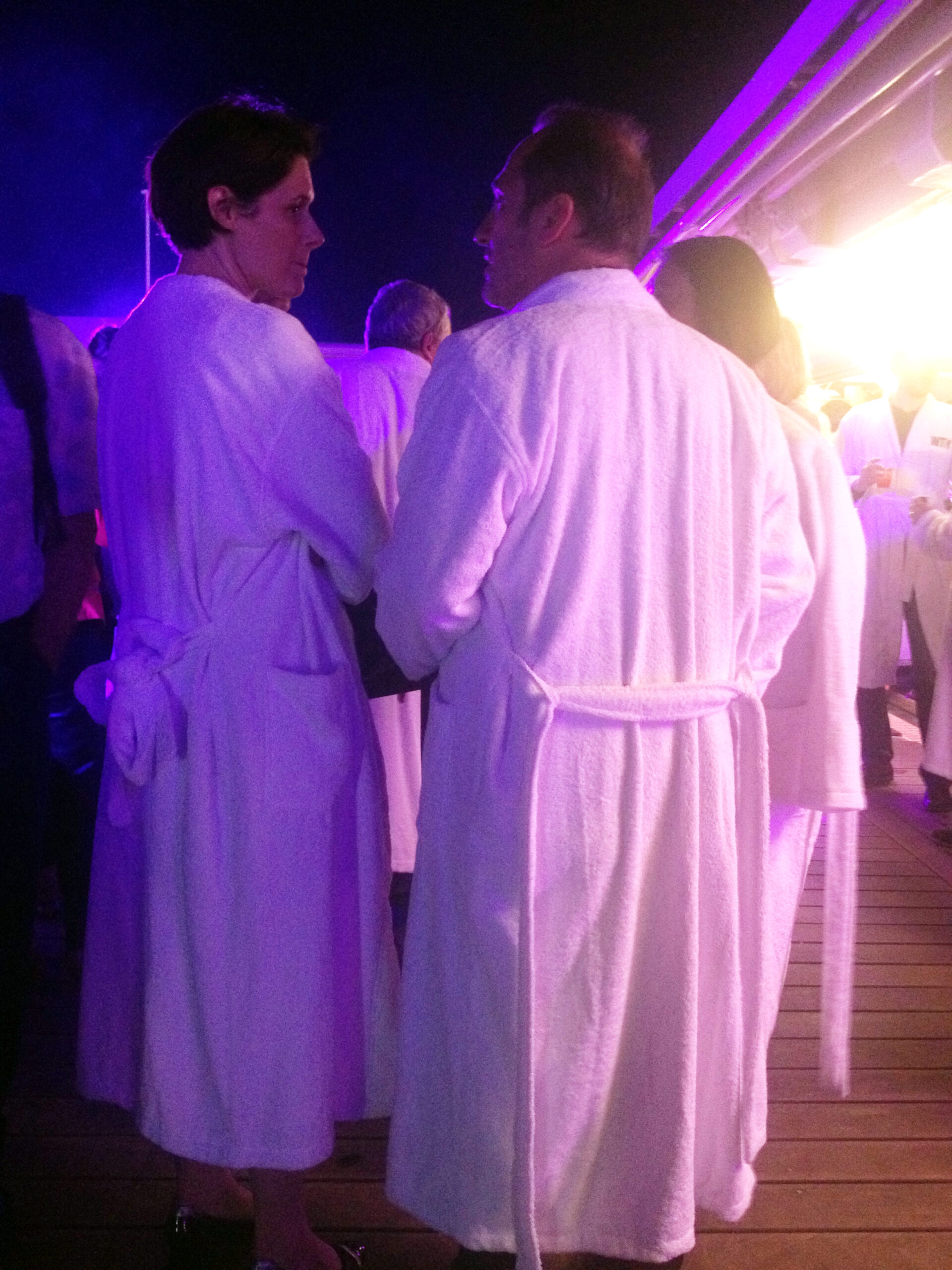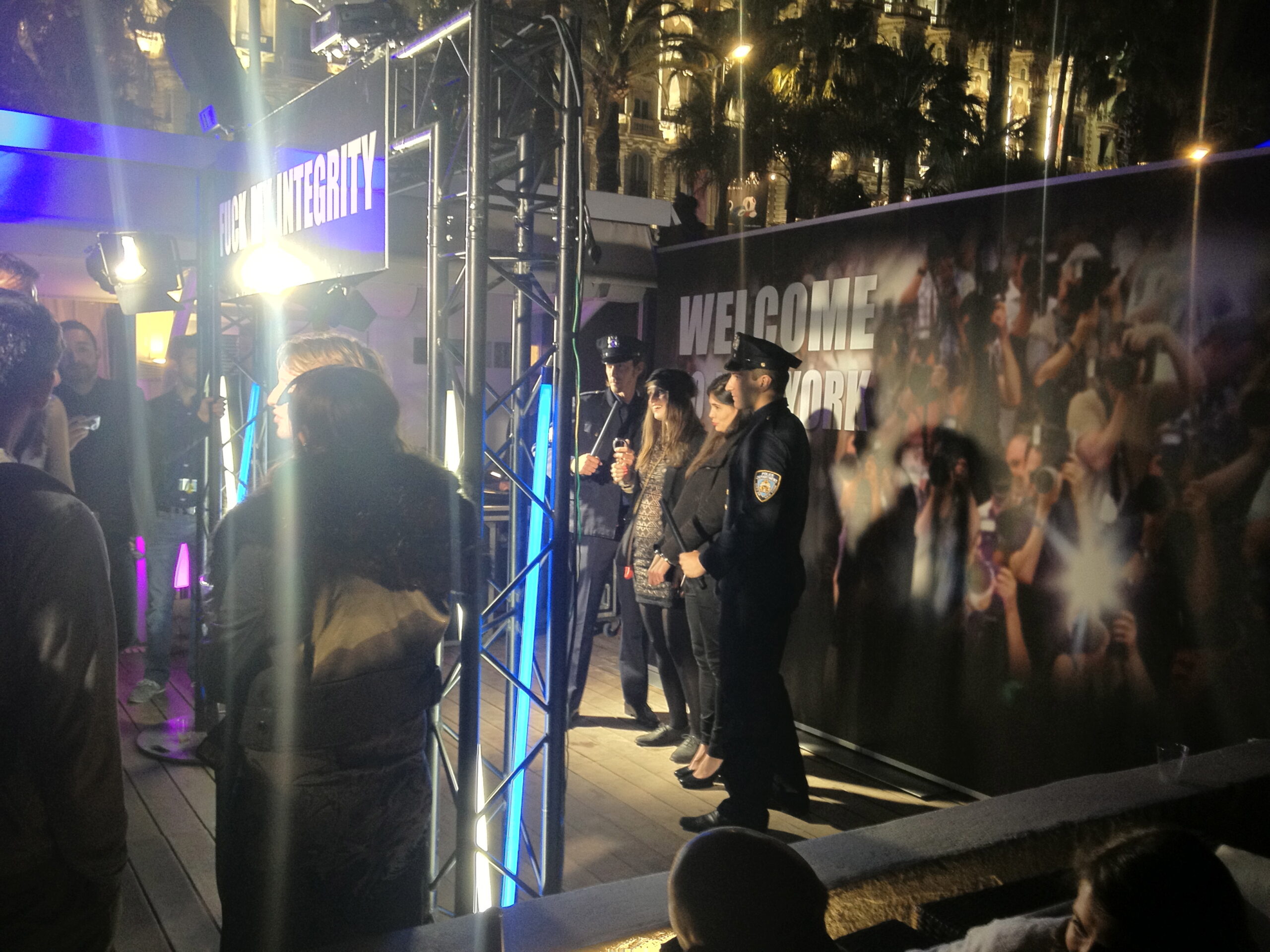 « Allez, quoi, c’est juste une photo, c’est hyper drôle ! ». À l’aise dans son peignoir blanc, l’homme insiste encore, s’énervant un peu, tout en sirotant frénétiquement sa vodka-tonic. Pourtant d’une nature docile, sa femme, à qui la honte fait légèrement rosir les joues, insiste en retour : elle n’a vraiment pas envie de le prendre en photo, menotté par deux faux policiers new-yorkais, sur le podium où se déploie l’affiche de Welcome to New York. Déjà, à l’entrée de la fête, elle n’avait accepté qu’en maugréant d’enfiler ce peignoir blanc que leur avait tendu l’hôtesse, en même temps qu’un martinet et une paire de menottes en plastique chinois. Pourtant quand son frère, qui est comptable chez Wild Bunch, lui avait tendu les invitations ce matin, elle s’était réjouie : elle allait peut-être voir Gérard Depardieu en chair et en os. Sauf que Depardieu est occupé à défendre le film, et que la conférence de presse n’est accessible qu’aux journalistes. Alors elle prend son mal en peine, sans lâcher d’une semelle son mari qui s’amuse comme un petit fou – il a ri surtout quand il a vu deux convives, déjà très éméchés, rejouer à côté du podium « Love Hotel » la scène fameuse du Sofitel. À côté d’elle, deux critiques de cinéma, qu’elle a reconnus à leur diction trainante et à leur accent parisien un peu surjoué, rient également mais d’une blague qui lui reste hermétique. Dans la blague, il était question de tragédie et de farce, et peut-être de Karl Marx, mais elle n’est pas sûr d’avoir bien entendu. Elle a aussi entendu autre chose, qui la chiffonne un peu. Alors elle voudrait l’avis du mari. Elle lui demande : « Chéri, tu crois que cette fête, c’est un peu comme si on célébrait un viol ? ». Dans le brouhaha, le mari n’a pas entendu. Elle n’a pas osé reposer la question, et le mari est parti au bar, recommander une vodka-tonic.